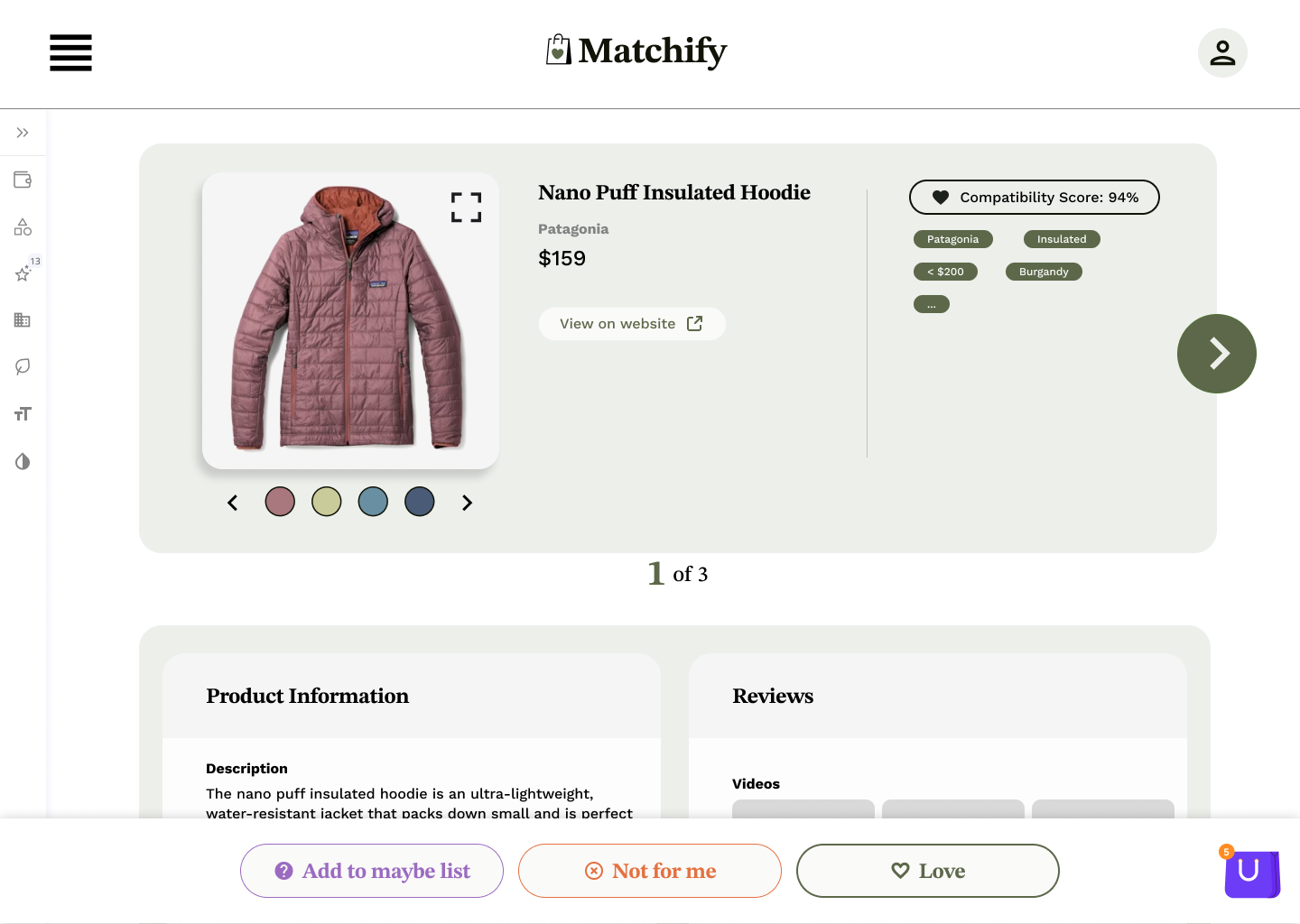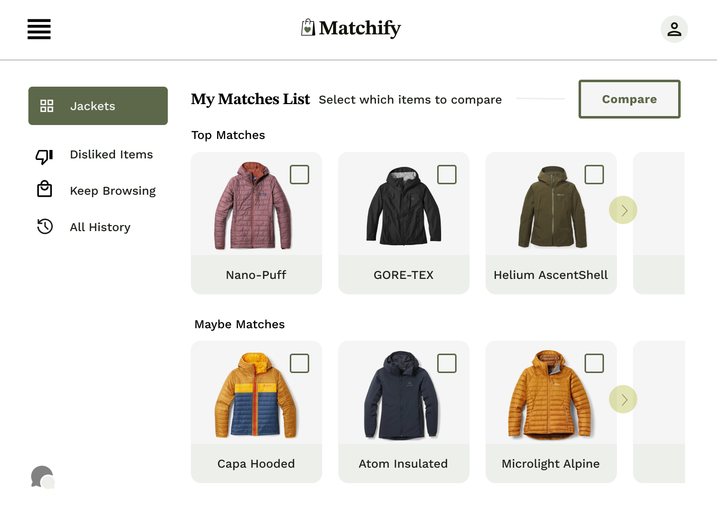 Matchify is web application that is designed to make choosing the right product easier. For products that have technical specifications like TVs or headphones, or products with a wide variety of options like cat food or jackets, it can be overwhelming to find the correct option. We wanted to explore this topic, and ask how users validate their choices, and why a product like this was needed.