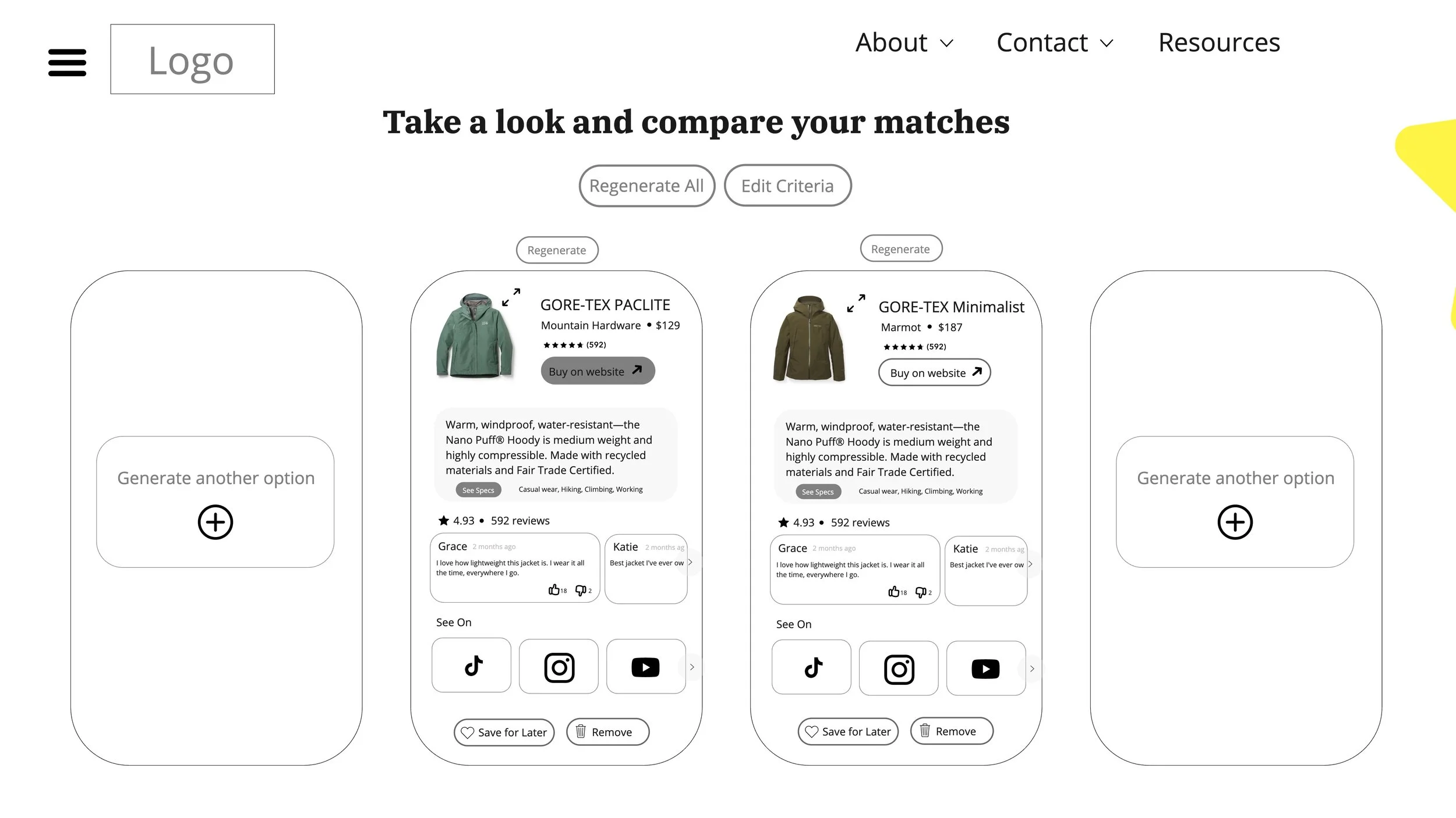 The framework for the project was Lean UX, where constant collaboration and iteration was the main focus instead of deliverables. Once we decided what project to pursue, we identified problems found in other sectors of the industry. Notable examples like finding the right MacBook or the right jacket framed our work.